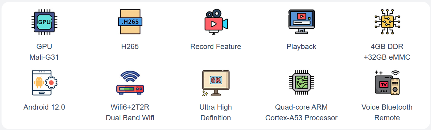 Equipped with a quad-core ARM Cortex-A53 processor and an independent Mali-G31 GPU, it delivers robust performance support. The combination of 4GB RAM and 32GB eMMC large-capacity storage ensures smooth operation and swift responsiveness.Whether for immersive viewing or high-speed gaming, enjoy uninterrupted premium streaming experiences, free from delays or lags.